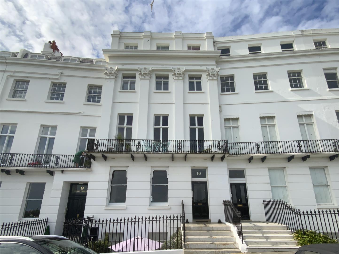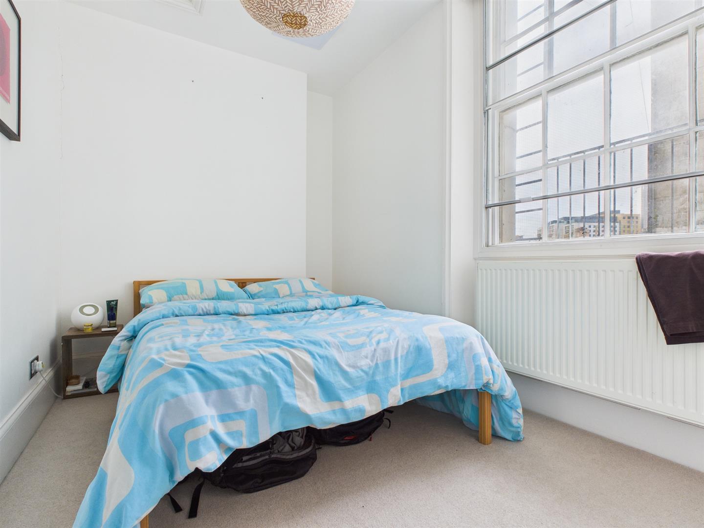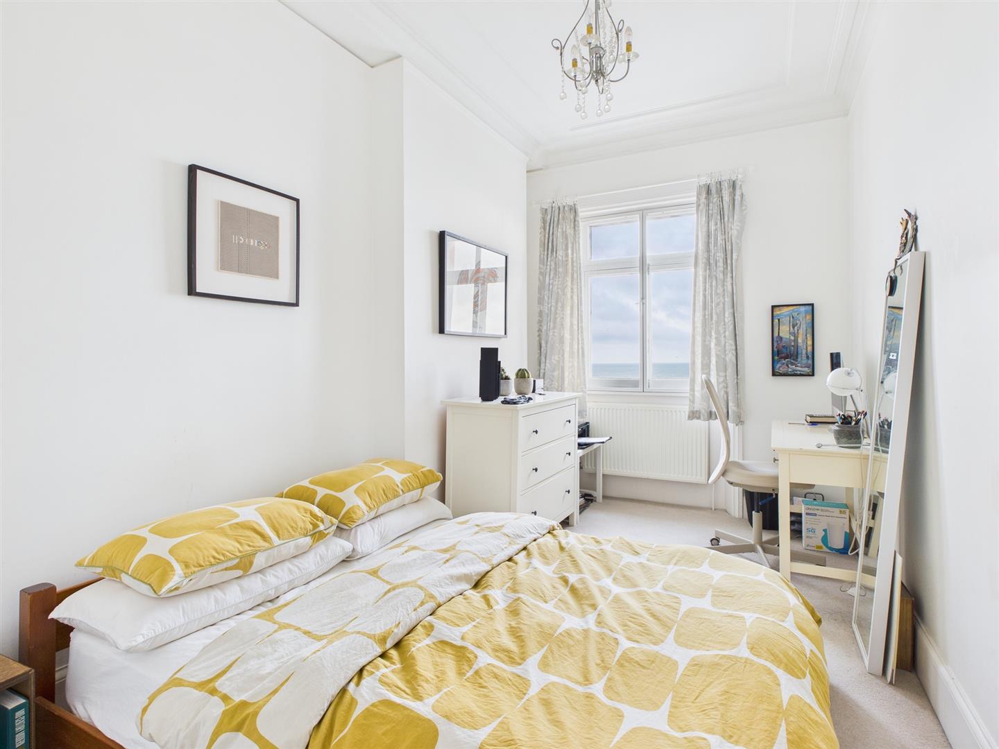 BEDROOM 1South/East aspect window with secondary glazing and views over Kemp Town Enclosures to the sea, ceiling coving, cupboard, radiator.