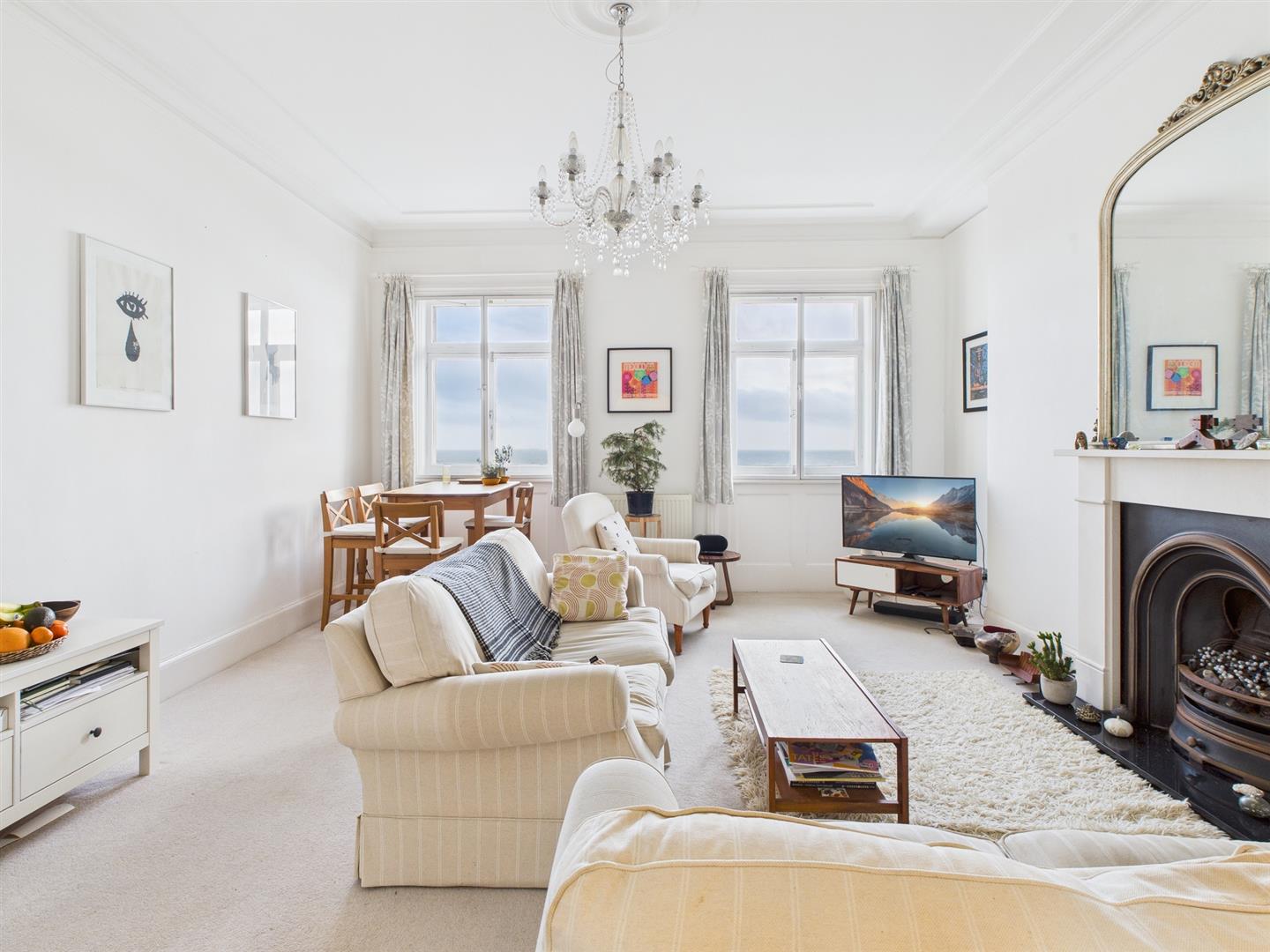 SECOND FLOORLOUNGE/DINING ROOMTwo South/East aspect windows with secondary glazing and views over Kemp Town Enclosures to the sea, ceiling coving and rose, feature fireplace with wooden mantle, cast iron inset and stone hearth, two radiators, multi pane glass doors to: