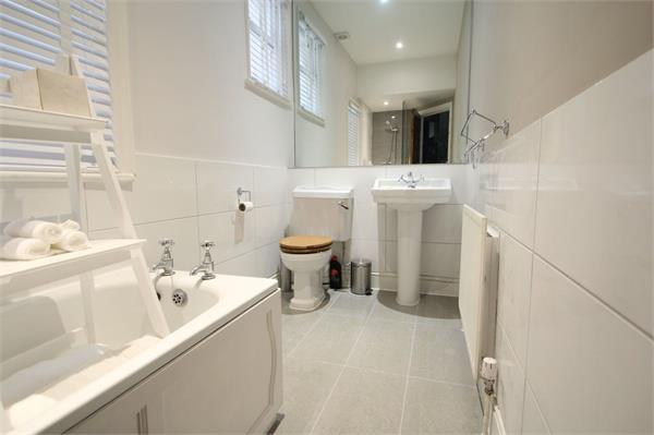 BATHROOMFitted with a white suite comprising panelled bath with mixer tap and shower attachment, screen to side, pedestal wash hand basin, low level close coupled WC, recessed downlighting, part tiled walls, fitted mirror, extractor fan, radiator, two South aspect windows.