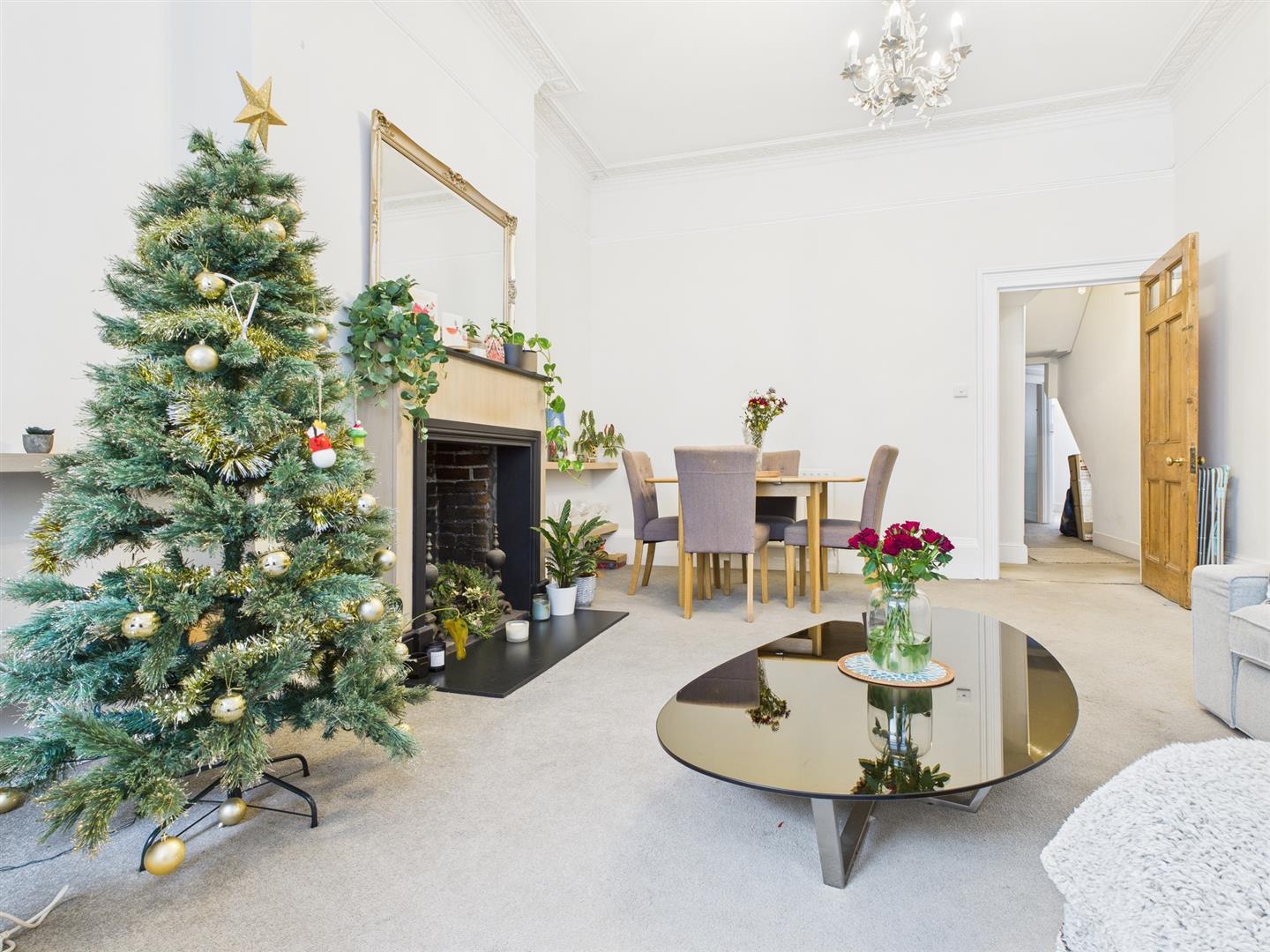 LOUNGE/DINING ROOMTwo sash windows with oblique view down Brunswick Square to the sea, feature fireplace, ornate ceiling coving and rose, radiator.