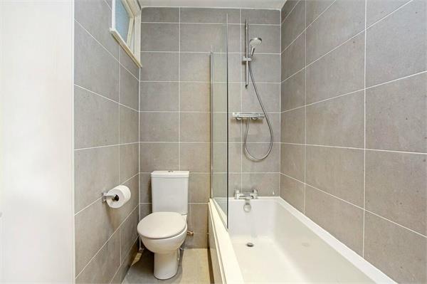 BATHROOMFitted with white suite comprising panelled bath, mixer tap with shower attachment, wall mounted shower, wash hand basin with mixer tap, mirror fronted medicine cabinet over, low level close coupled WC, recessed downlighting, tiled walls, tiled floor, ladder style heated towel rail, frosted window.