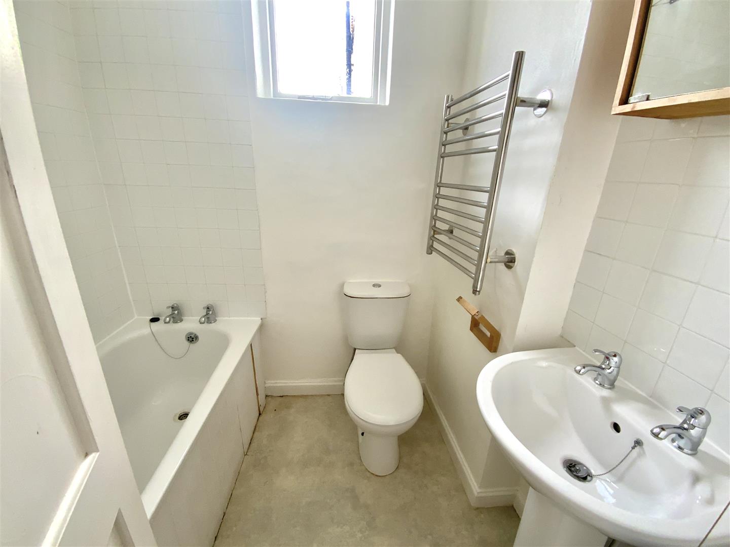 BATHROOMFitted with white suite comprising panelled bath with electric shower over, wash hand basin, low level close coupled WC, chrome ladder style heated towel rail, part tiled walls, South aspect window.