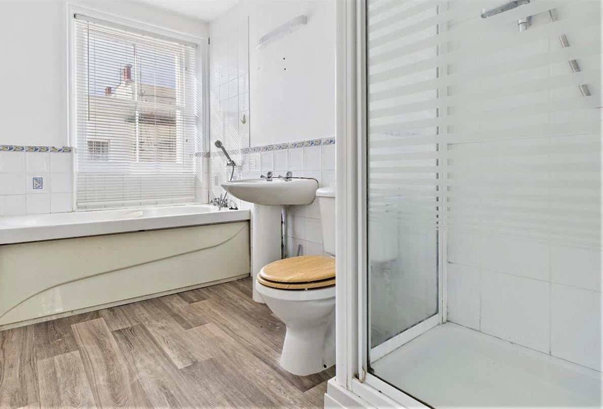 BATHROOMFitted with white suite comprising panelled bath with mixer tap and shower attachment, pedestal wash basin, low level close coupled WC, part tiled walls, extractor fan, radiator, East aspect multi frosted glass paned window.