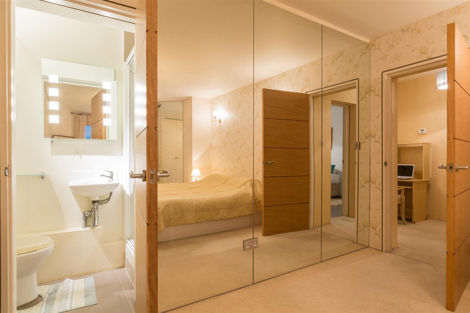 BEDROOM ONETwo West aspect sash windows, range of fitted wardrobes, door to: