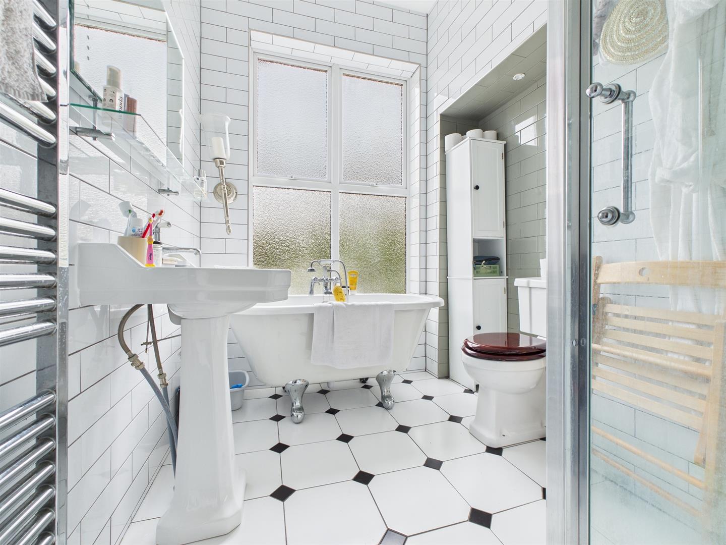 BATH/SHOWER ROOMFitted with white suite comprising tiled shower cubicle with fixed and flexible shower heads, roll edge claw foot bath with period style mixer tap and shower attachment, pedestal wash basin with period style mixer tap, low level close coupled WC, recessed downlighting, tiled walls, tiled floor, chrome ladder style heated towel rail, frosted double glazed window.