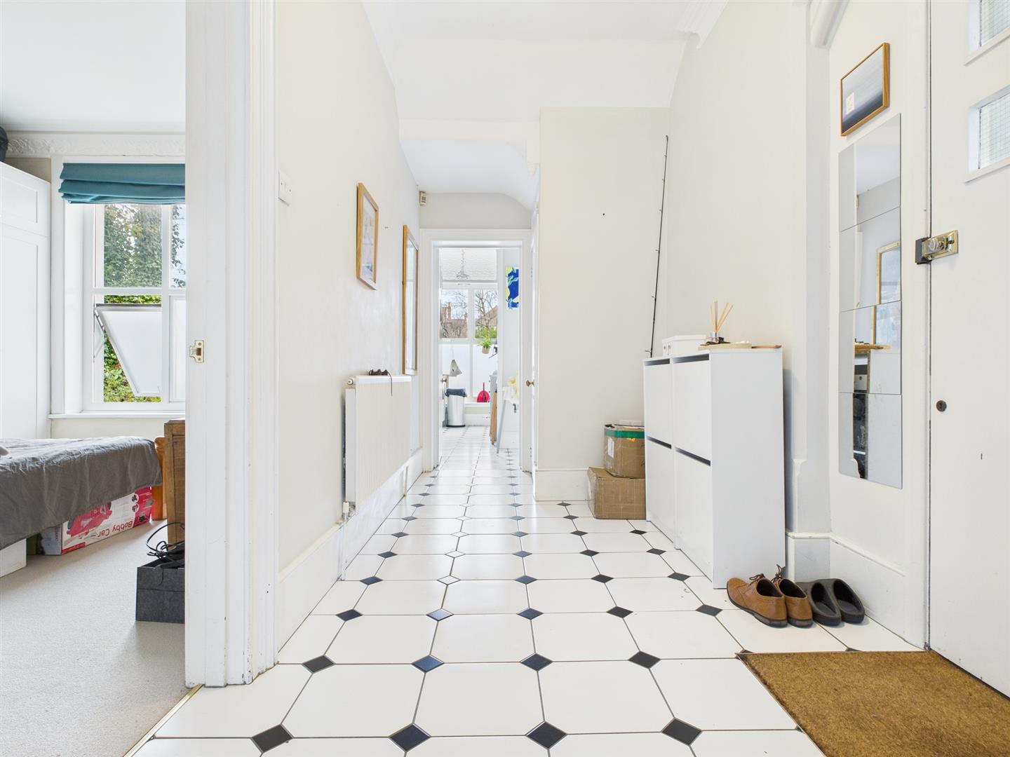 RAISED GROUND FLOORENTRANCE HALLSpacious store room with frosted glass window housing boiler, further fitted cupboard with drawers, tiled floor.