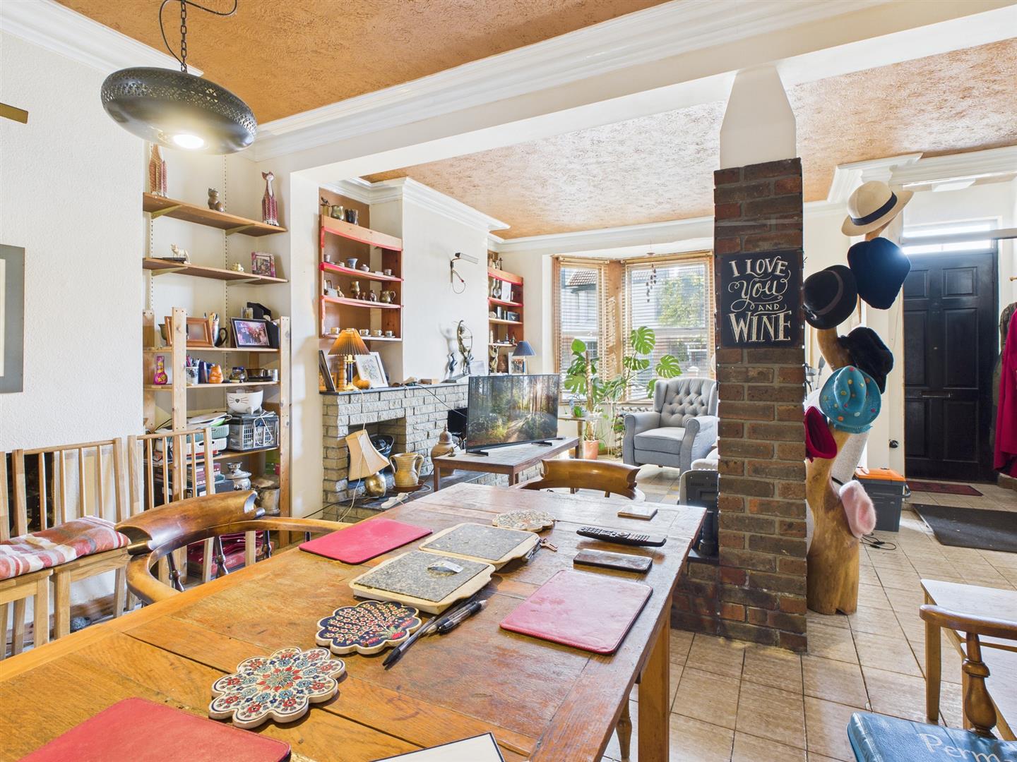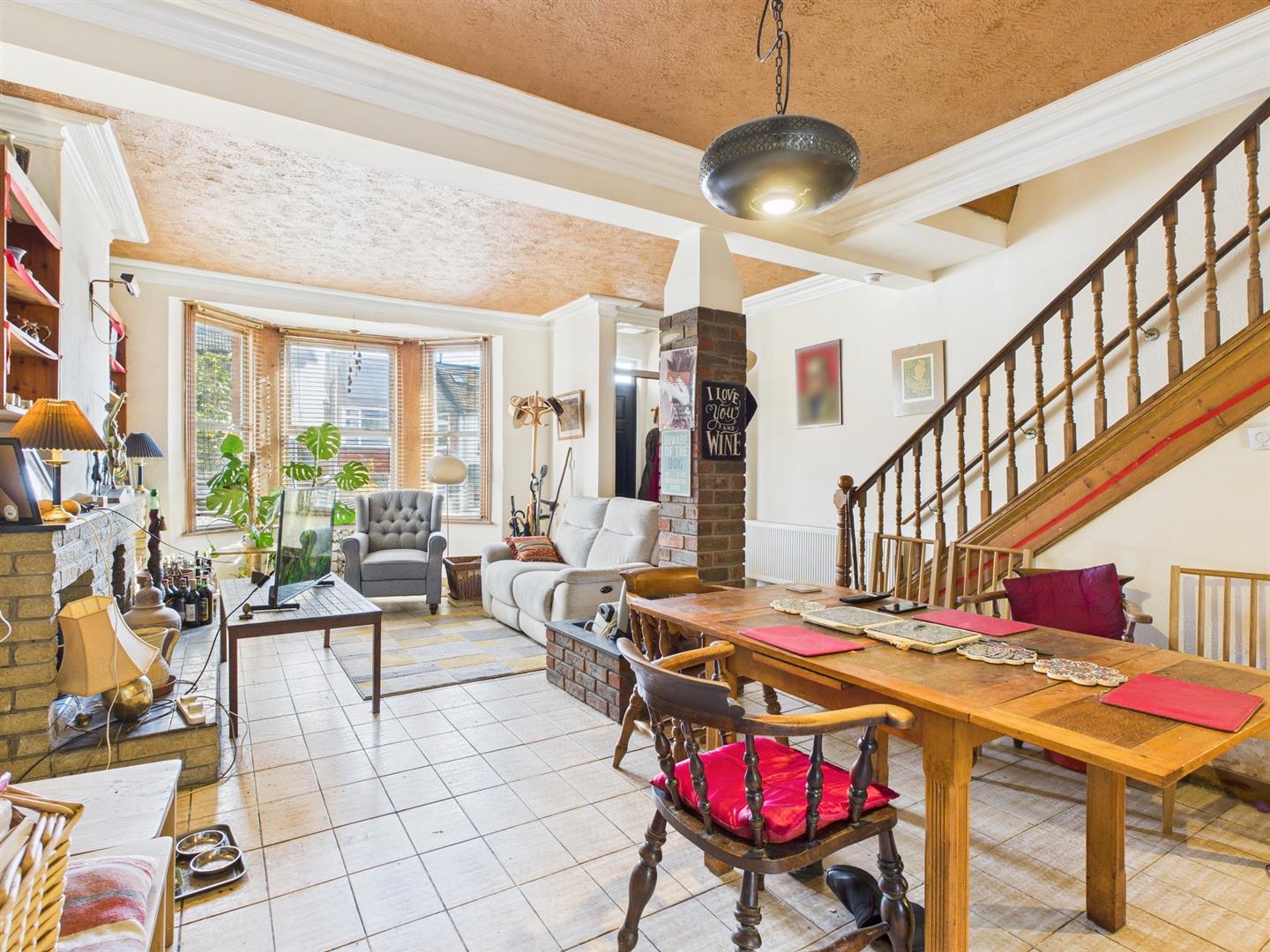 LOUNGE/DINING ROOMThree East aspect double glazed windows to bay, ceiling coving, feature brick fireplace, tiled floor, radiator, stairs to FIRST FLOOR, open square arch with steps up to: