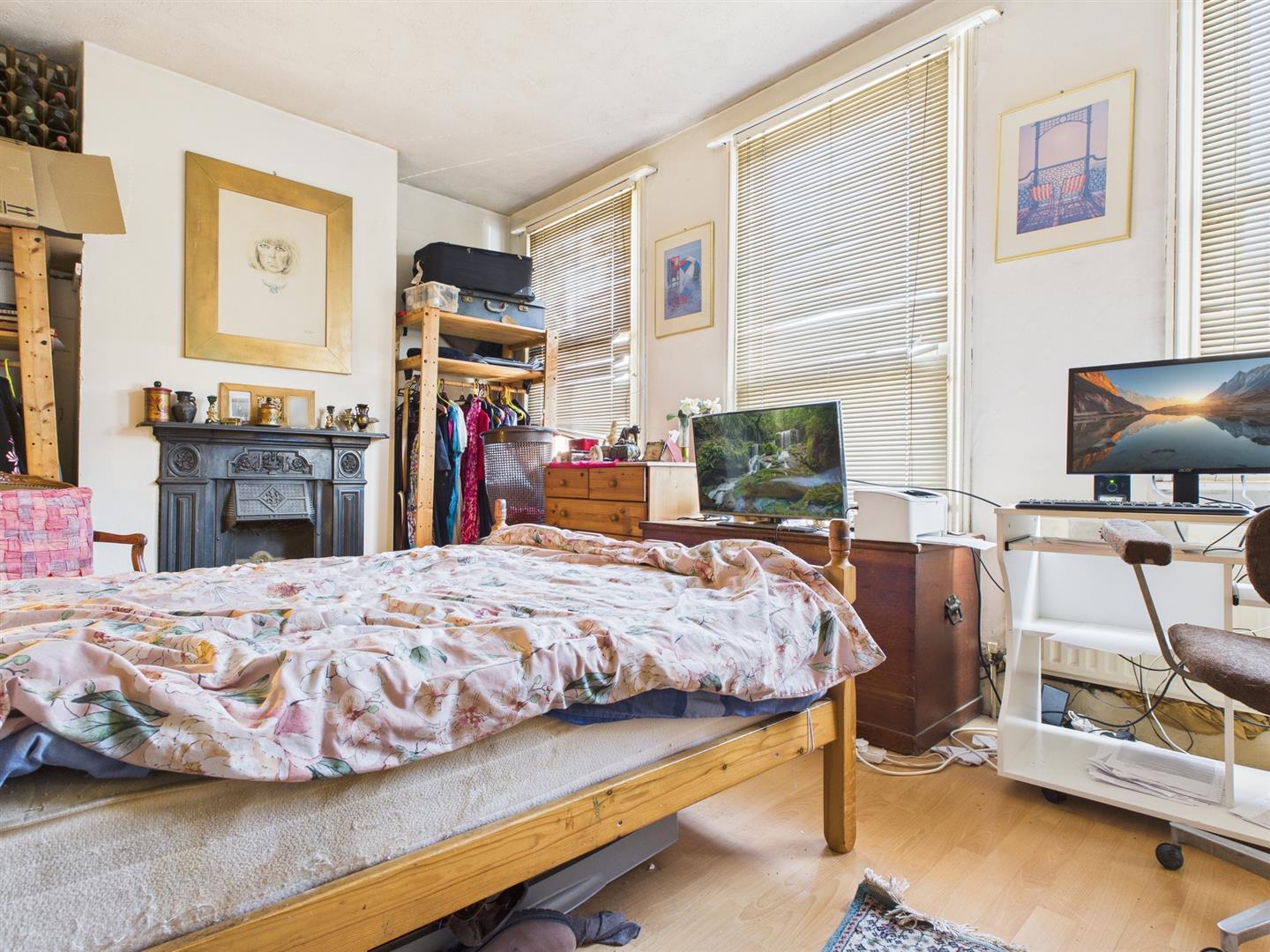 BEDROOM 1Three East aspect sash windows one as floor to ceiling giving access to BALCONY, feature cast iron fireplace, laminated wooden flooring.