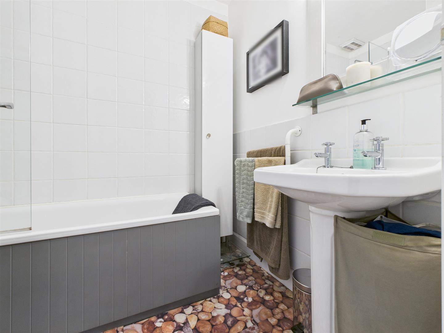 BATHROOMFitted with white suite comprising panelled bath with electric shower over, screen to side, pedestal wash hand basin, low level WC, part tiled walls, medicine cabinet, wall mounte electric convector heater.