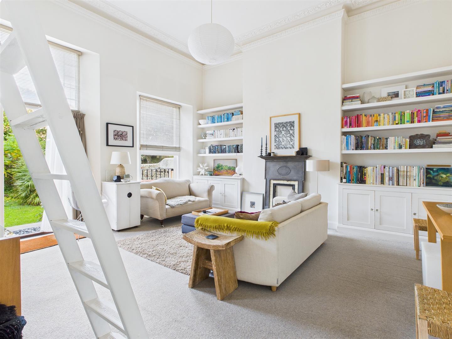 West aspect window with views over the REAR GARDEN, multi glass paned door with window over to REAR GARDEN, ornate coving, cupboards and shelving to chimney recess's, electric heater, open square arch to: