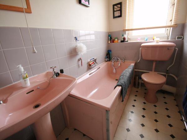BATHROOMFitted with pink suite comprising panelled bath with electric shower over, wash hand basin, low level close coupled WC, part tiled walls, heated towel rails, frosted double glazed window..