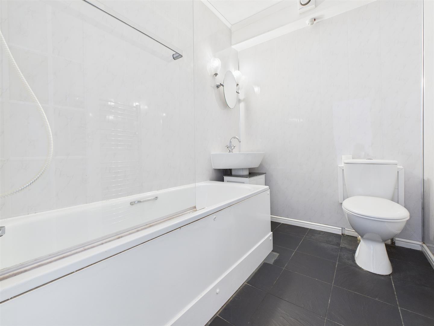 BATHROOMFitted with white suite comprising panelled bath with mixer tap with shower attachment, screen to side, pedestal wash hand basin with mixer tap, fitted mirror and two wall light points over, low level close coupled WC, tiled floor, extractor fan, chrome ladder style heated towel rail.