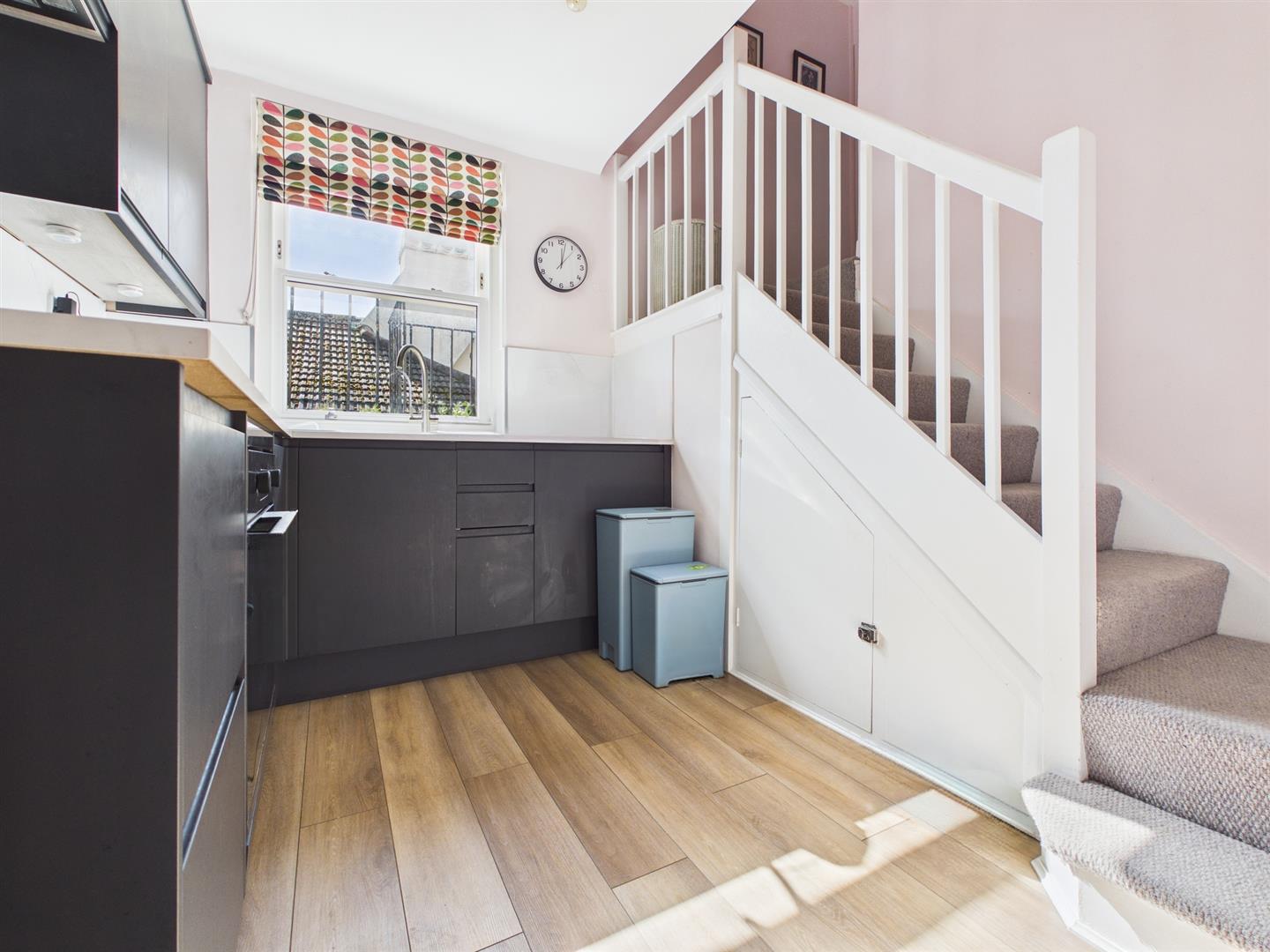 KITCHENModern fitted kitchen comprising a range of eye level wall cupboards and base cupboard and drawer units, shelving, marble effect worktops and splashbacks, single bowl single drainer sink unit with mixer tap, electric oven, electric hob with glass splashback and extractor fan over, washing machine, dishwasher, ceiling spotlights, understairs cupboard, cupboard housing electric meter and RCD unit, laminated wooden flooring, wall mounted electric heater, South aspect double glazed window, open doorway to: