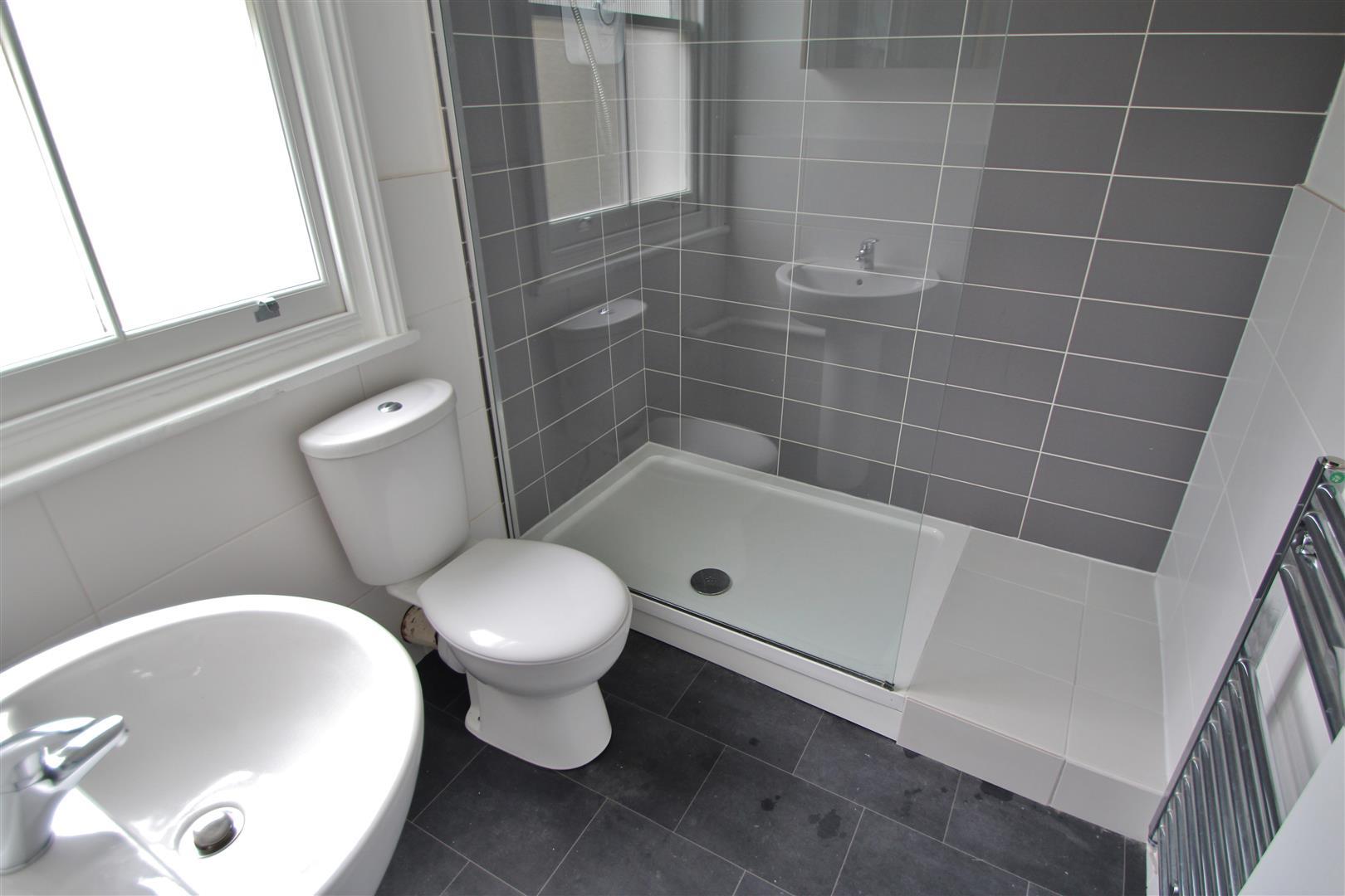 SHOWER ROOMModern white suite comprising walk in tiled shower cubicle with 'Mira' electric shower, wash hand basin with mixer tap and drawers under, low level close coupled WC, chrome ladder style heated towel rail, recessed downlighting, frosted glass sash window.