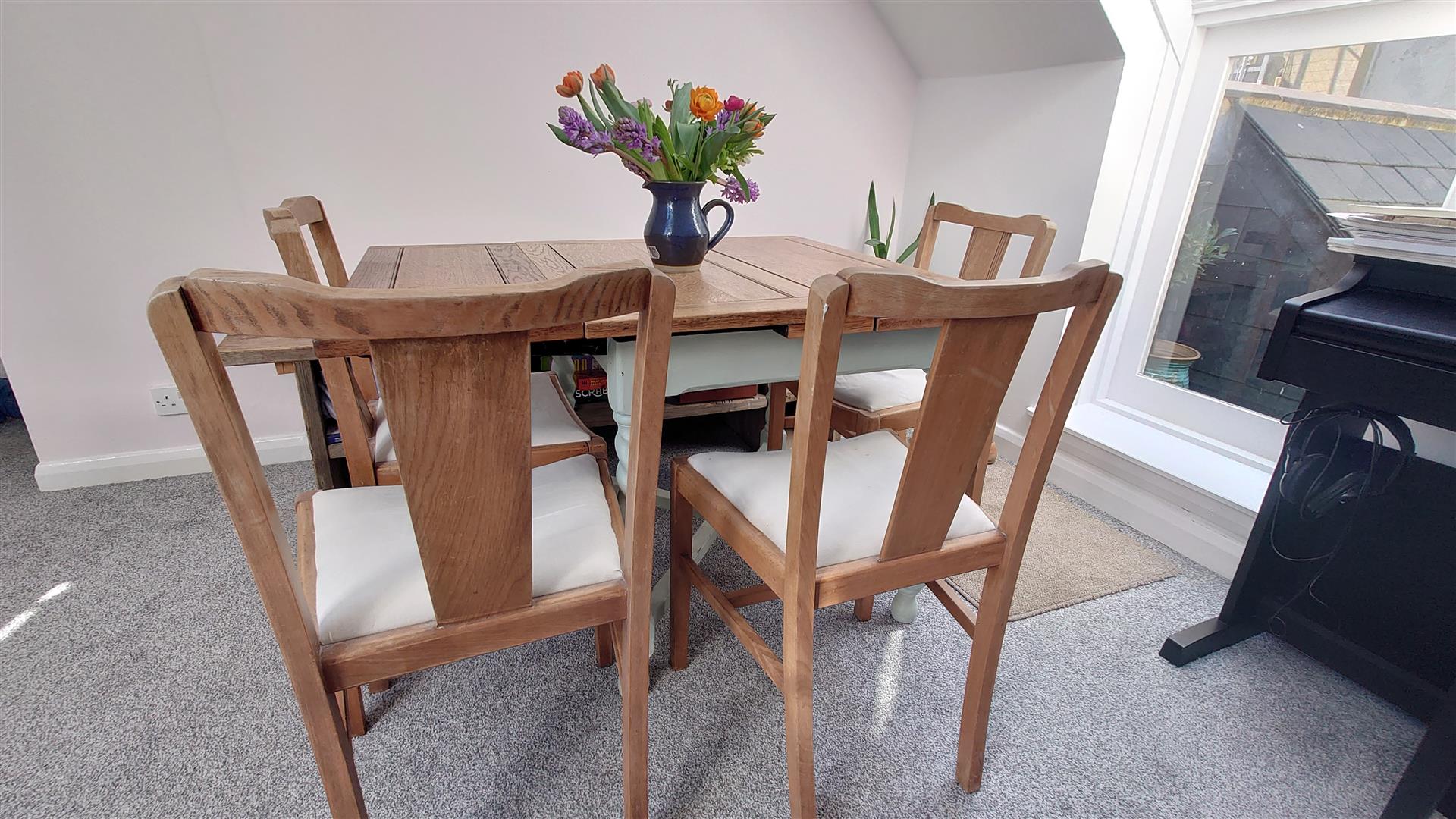 Split level, L-Shaped, sash window, recessed downlighting, storage cupboard, entryphone system, laminated wood flooring, radiator.