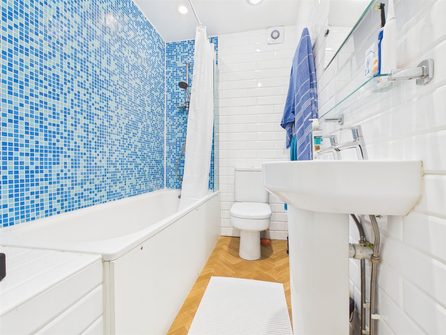 Fitted with white suite comprising panelled bath with mixer tap with shower attachment, pedestal wash basin with glass shelf and mirror over, low level close coupled WC, recessed downlighting, tiled walls, chrome ladder style heated towel rail, extractor.