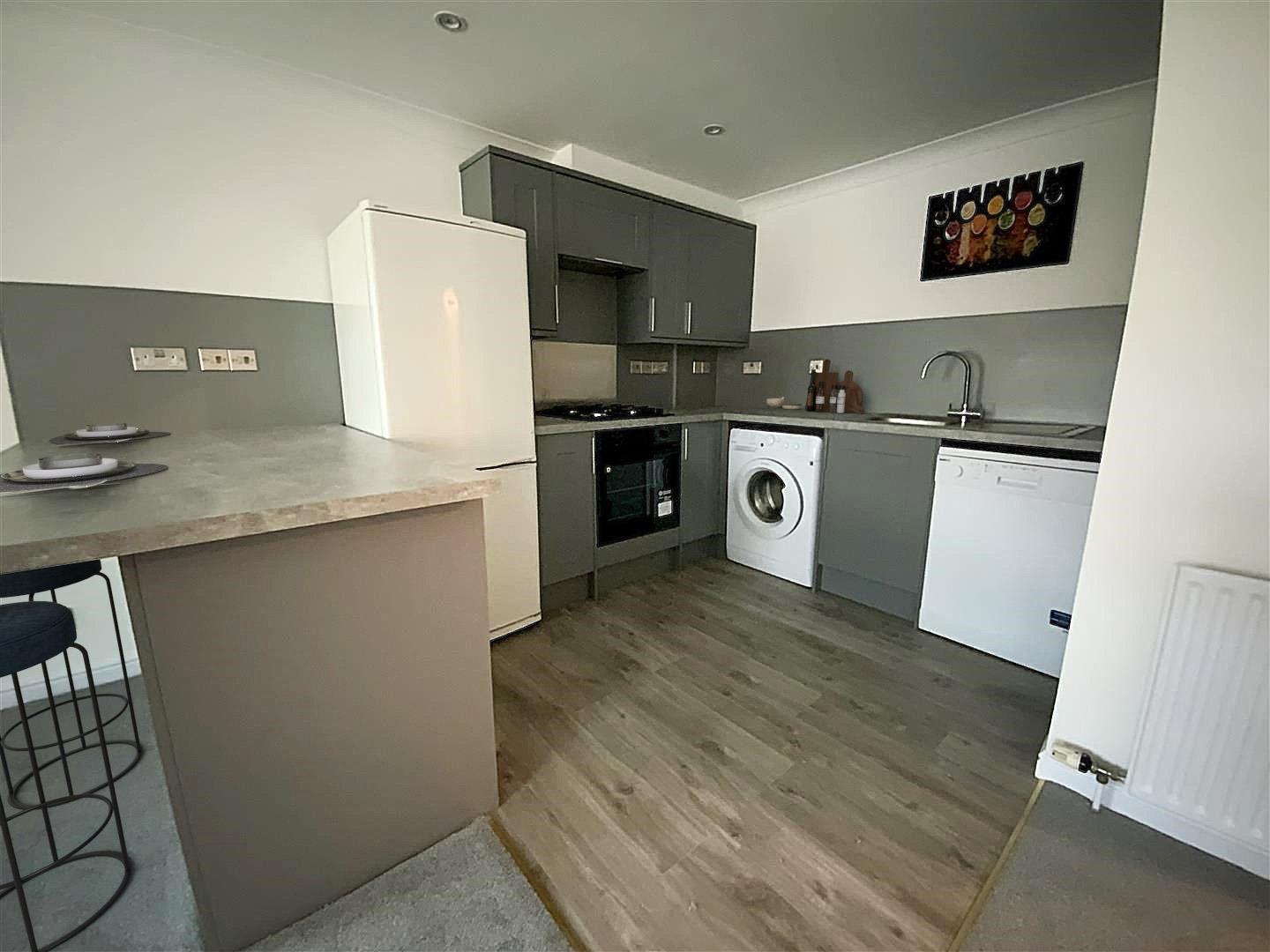 KITCHEN AREAModern fitted kitchen comprising eye level wall cupboards and base cupboards, worktops, stainless steel single bowl single drainer sink unit with mixer tap, electric oven, four ring gas hob with stainless steel extractor over, washing machine, dishwasher, fridge/freezer, recessed downlighting, cupboard housing boiler..