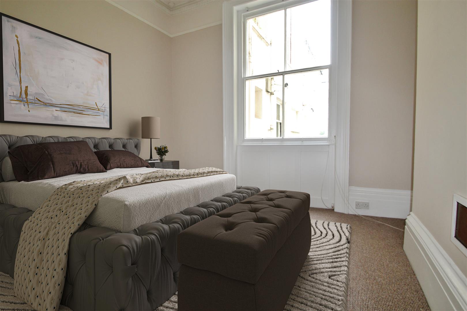 BEDROOM 2West aspect sash window, high ceiling with ornate coving and rose, high skirting, radiator. Note: There is wooden flooring which had to be covered by carpet for the purpose of renting but as owner occupiers this can be removed.