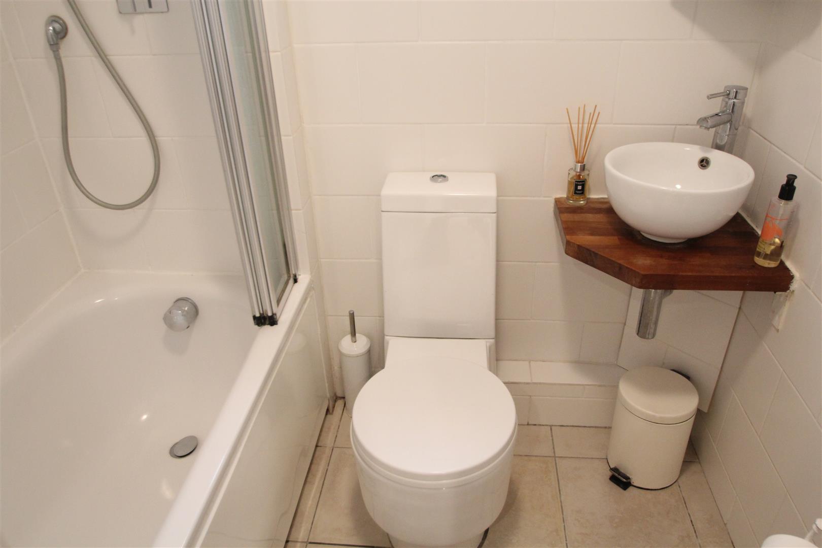 BATHROOMFitted with white suite comprising panelled bath with mixer tap and shower attachment, screen to side, wash hand basin with mixer tap set on wooden worktop, Low level close coupled WC, tiled walls, tiled floor, window.