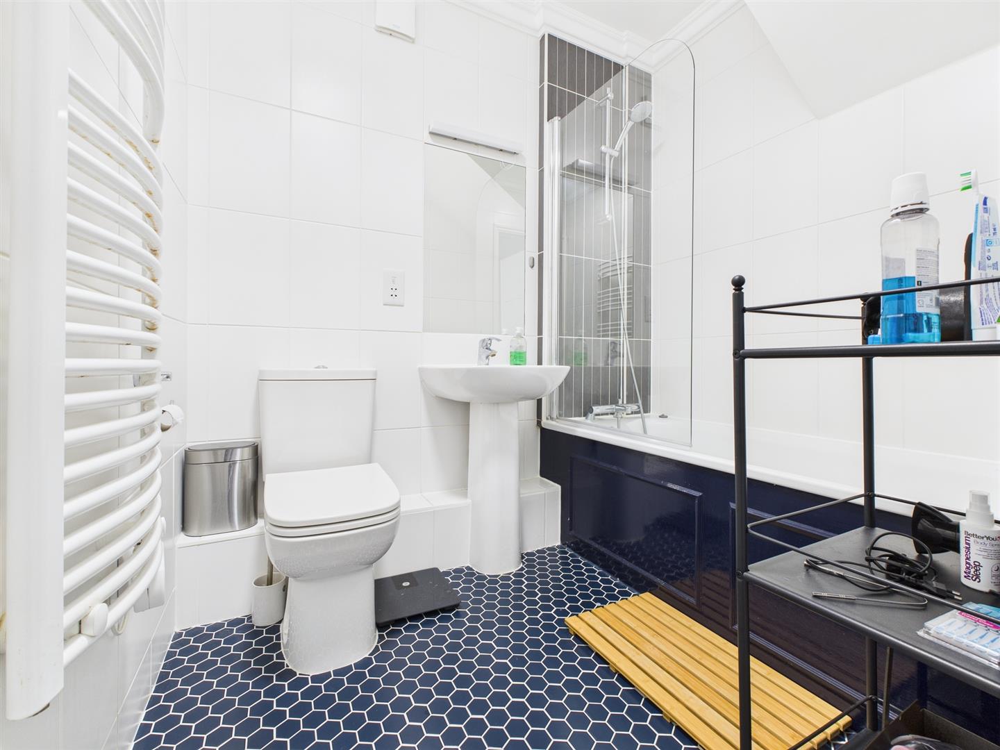 EN SUITE BATHROOMFitted with white suite comprising panelled bath with mixer tap and shower attachment, pedestal wash hand basin with mixer tap and mirror over, low level close coupled WC, ceiling coving, tiled walls, hexagon shaped tiles to floor, ladder style heated towel rail.