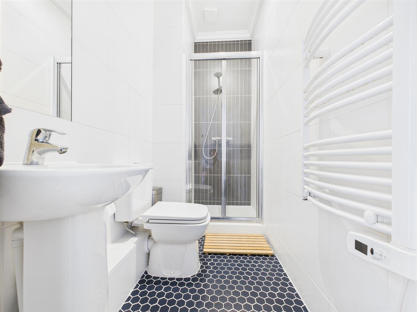 SHOWER ROOMFitted with white suite comprising tiled shower cubicle, pedestal wash hand basin with mixer tap anf titted mirror and light over, ceiling spotlights, extractor fan, Hexagon shaped tiles to floor.