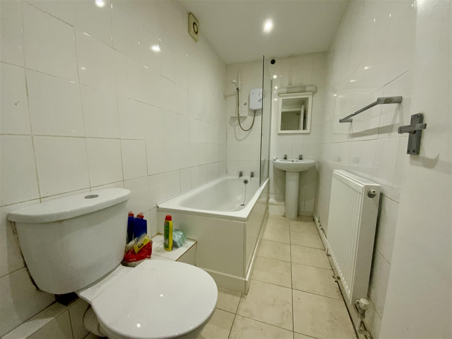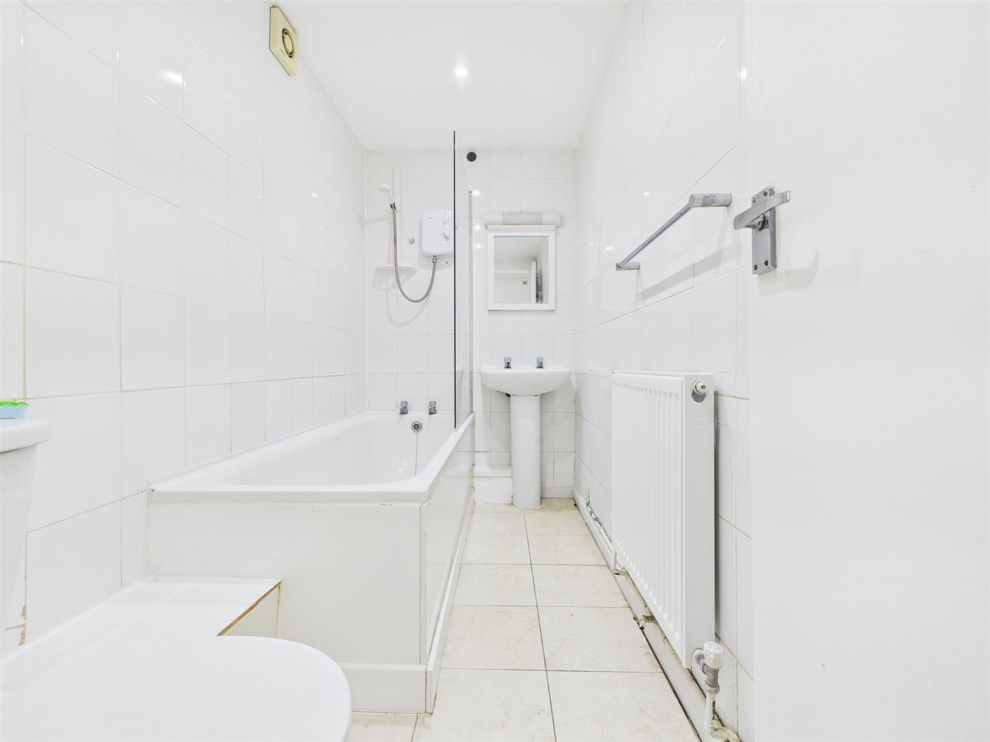 BATHROOMFitted with white suite comprising panelled bath with electric shower over, (Not tested), pedestal wash hand basin, low level close coupled WC, recessed downlighting, tiled walls, tiled floor, extractor fan, radiator.