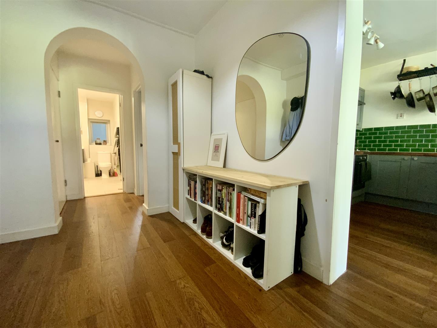 LOWER GROUND FLOORENTRANCE HALLWardrobe with plumbed space for washing machine, cupboard housing electric meter, wooden flooring, borrowed light window, radiator.
