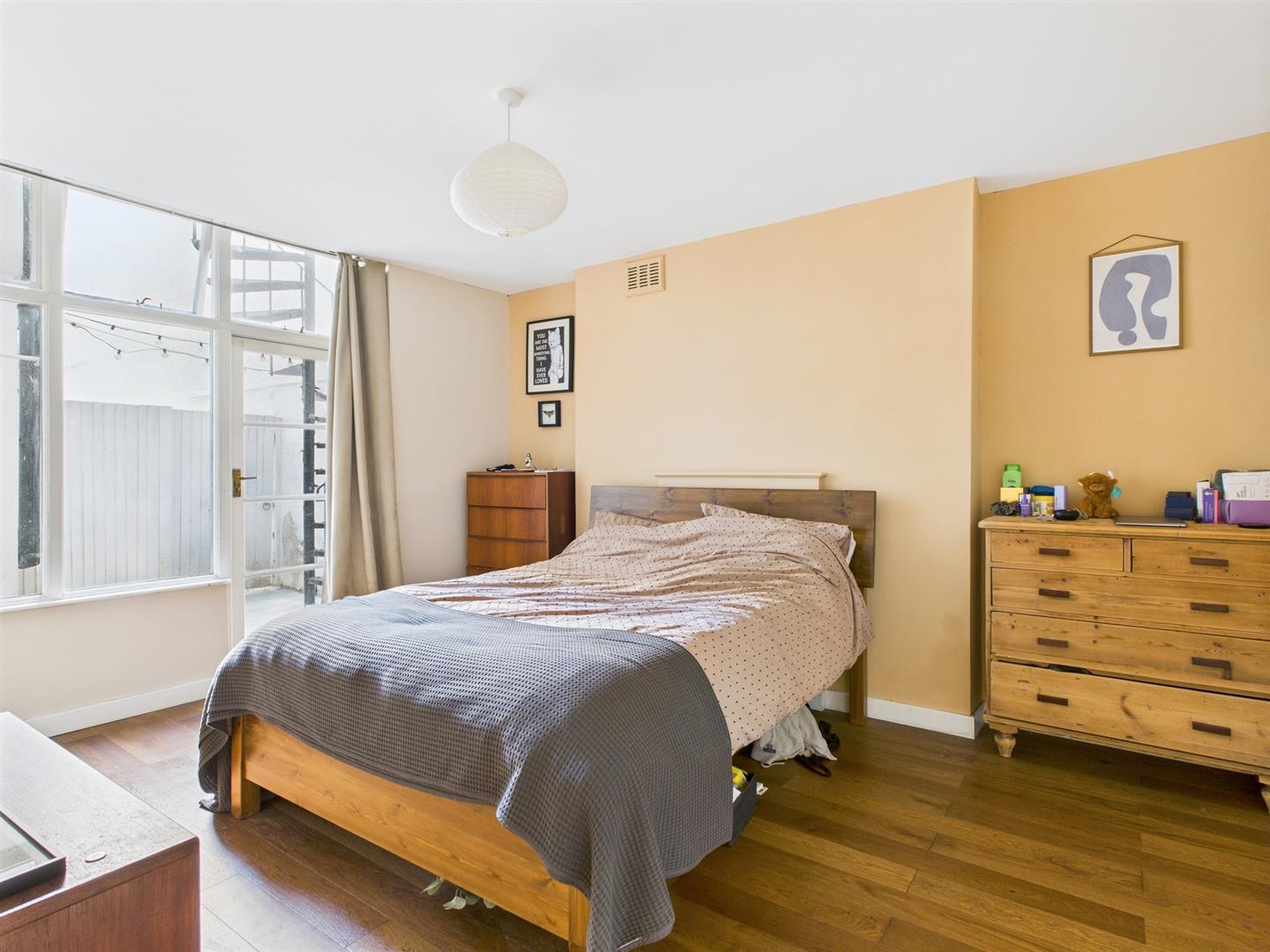 BEDROOMMulti glass pane door with windows over and to side to PATIO/GARDEN, cupboard housing boiler, walk-in wardroce, wooden flooring, radiator.