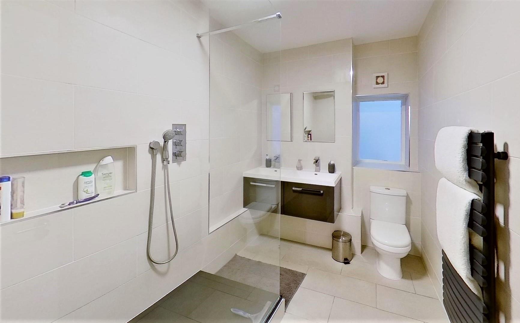 SHOWER ROOMFitted with white suite comprising tiled shower cubicle with fixed and flexible hose shower heads, wash hand basin with mixer tap and drawer under, fitted mirror over, low level close couple WC, tiled walls, tiled floor, ladder style heated towel rail, extractor fan, frosted glass window.