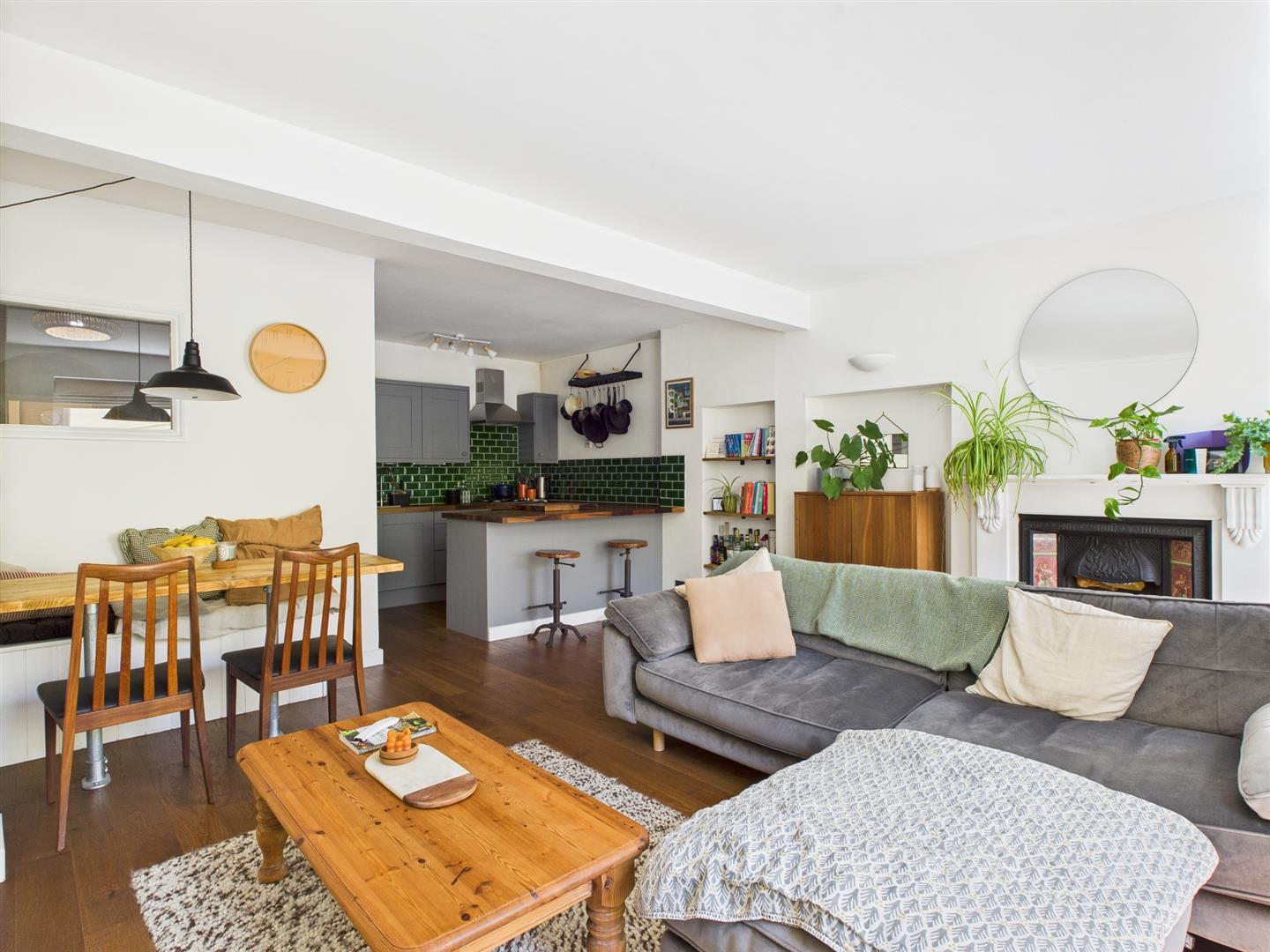 OPEN PLAN LOUNGE/KITCHENTwo South aspect sash windows, feature fireplace with wooden mantle, tiled, cast iron inset, stone hearth,two radiators.