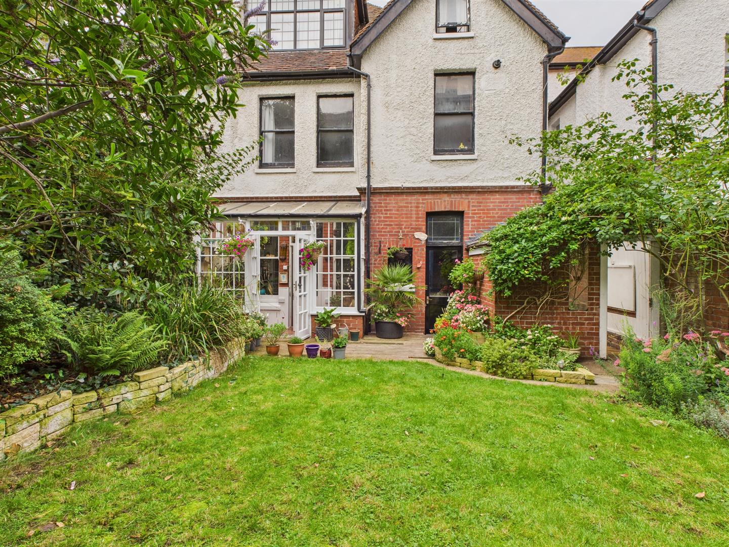 EXTERNALREAR GARDENLawned with terrace and raided borders to sides with mature planting.