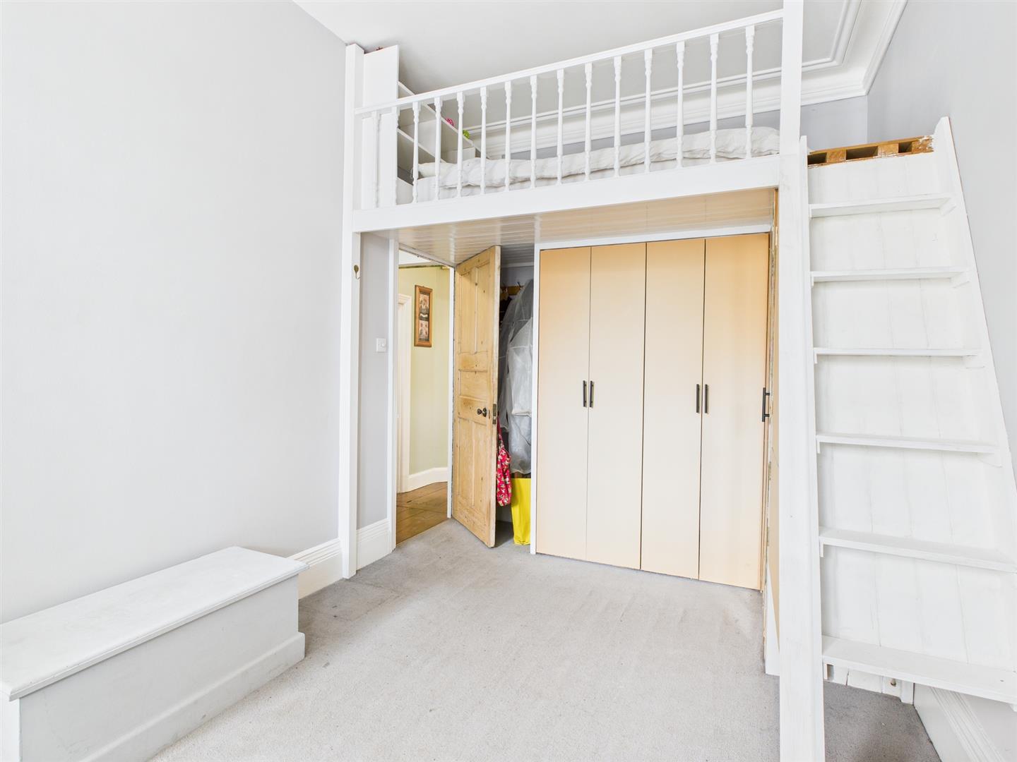 BEDROOM 1Three West aspect sash windows, ceiling coving, mezzanine bed platform with cupboards under, ceiling spotlights, radiator.